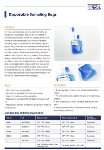 应用于细胞培养过程采样,微生物发酵过程采样,液体配制过程采样,小规模培养基和缓冲液的储存与运输,中间产品或半成品的储存与转移等